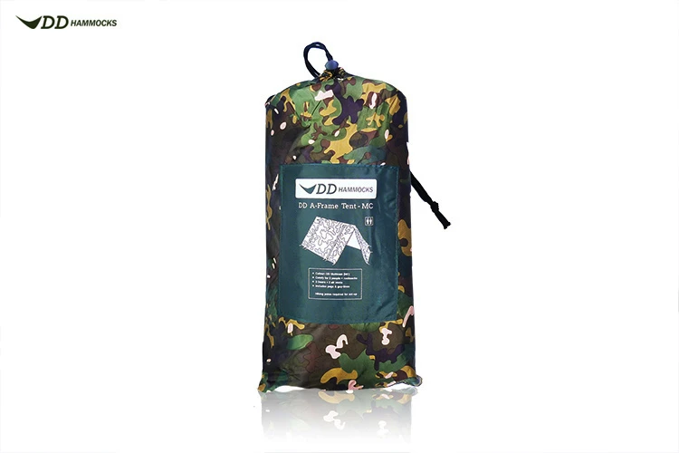 DD Hammocks A-Frame Tent (Multicam) Blend into the wilderness with the DD A-Frame Tent in Muticam. The DD A-Frame Tent is designed to be pitched over the top of the DD SuperLight A-Frame Mesh Tent (sold separately) to create a stormproof and bugproof set-up with 3 separate entrances, but is more than capable when used by itself as a rainy-day shelter, or an even lighter tent when insect protection may not be needed. Spacious enough for 2 people plus rucksacks, and taking advantage of our very effective DD Multicam pattern, this tent will blend in to all kinds of natural woodland environments keeping your campsite away from prying eyes! The A-Frame Tent-MC has 3 doors, the largest of which on the long side can be raised to form an entrance canopy with the aid of poles or sticks – this creates an ideal viewpoint for relaxing evenings when it’s not quite dry! Remaining lightweight, this tent has a full 3,000mm rated waterproof PU coating, complete with fully taped seams, and will keep the storms at bay throughout your future adventures. Features DD Multicam print, to allow seamless camouflage in a number of environments Taped seams Extra loops on the edges, to guy out for extra stability in windy conditions 3 zippered entrances: one on each end and one on the side Entrances can be rolled and affixed open, or raised to form an entrance canopy with the aid of further Hiking Poles or sticks Air vents on either side to help reduce the build up of condensation Eyelets at both ends to affix structural hiking poles Includes 13 Pegs and 4 guylines to secure the tent to the ground Ventilated and waterproof Specifications Size: Length – 345cm, Width – 150cm, Height – 115cm Colour: Multicam Weight: 930g (Excluding pegs & guy-lines) Includes: Tent, 13 x Pegs, 4 x Guylines (2m), Stuff sack Capacity: Suitable for 2 people (plus rucksacks) Please Note: Hiking Poles are required for Set-up (Sold Seperately) (DDA-FrameTent-MC)