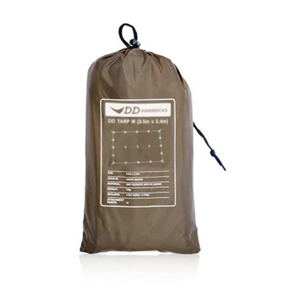 DD Hammocks DD Tarp M 3.5m x 2.4m Ideal for hammock camping, the DD Tarp M provides further coverage for the head and foot ends of your hammock while economising on side coverage to keep pack weight to a minimum. With enough coverage for all DD Hammocks, we recommend the Tarp M for one person plus gear. Arrange it in an A-frame over your hammock for storm protection, or even use it to extend a porch on your tent. 19 re-inforced attachment points allow for many different setup configurations. Features: 19 tough reinforced attachment points: 16 around the sides and corners, and 3 along the centre (ridge line) 4 x pegs and guy lines included in their own bag Made from 190T polyester with PU 3000mm waterproof coating, and has a taped central seam Stuff sack with drawcord closure Specifications Size: 3.5m x 2.4m Colour: Olive green or Coyote Brown (Please Select Colour) Weight: 740g (excl. pegs & guy lines) Includes: Tarp M, 4 x pegs & guy lines, stuff sack (DDTarpM_P)
