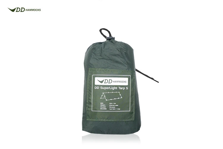 DD Hammocks SuperLight Tarp S (Olive Green) The DD SuperLight Tarp S is the lightest rain shelter from the DD Hammocks range – its tiny pack size allows it to easily fit into a jacket pocket and it has a number of uses! Perfect for ground bivi camping, it provides plenty of shelter for one person and gear. It also makes a great day shelter or ground sheet, easily and quickly set up for lunch stops and rest breaks out on the trail. An ideal companion for extreme and adventure sports like cycling, climbing or trail running, the DD Superlight Tarp S will keep you dry on rest stops while keeping your pack weight to an absolute minimum. Features: 19 tough reinforced attachment points: 16 around the sides and corners, and 3 along the centre (ridge line) 4 x SuperLight pegs and guy lines included in their own bag Made from ripstop nylon, with 3,000mm PU waterproof coating, and has a taped central seam Stuff sack with drawcord closure Specifications: Size: 2.8m x 1.5m Colour: Olive green Weight: 260g (excl. pegs & guy lines) Includes: SuperLight Tarp S, 4 x SuperLight pegs & guy lines, stuff sack (DDSuperLightTarpS-OG)