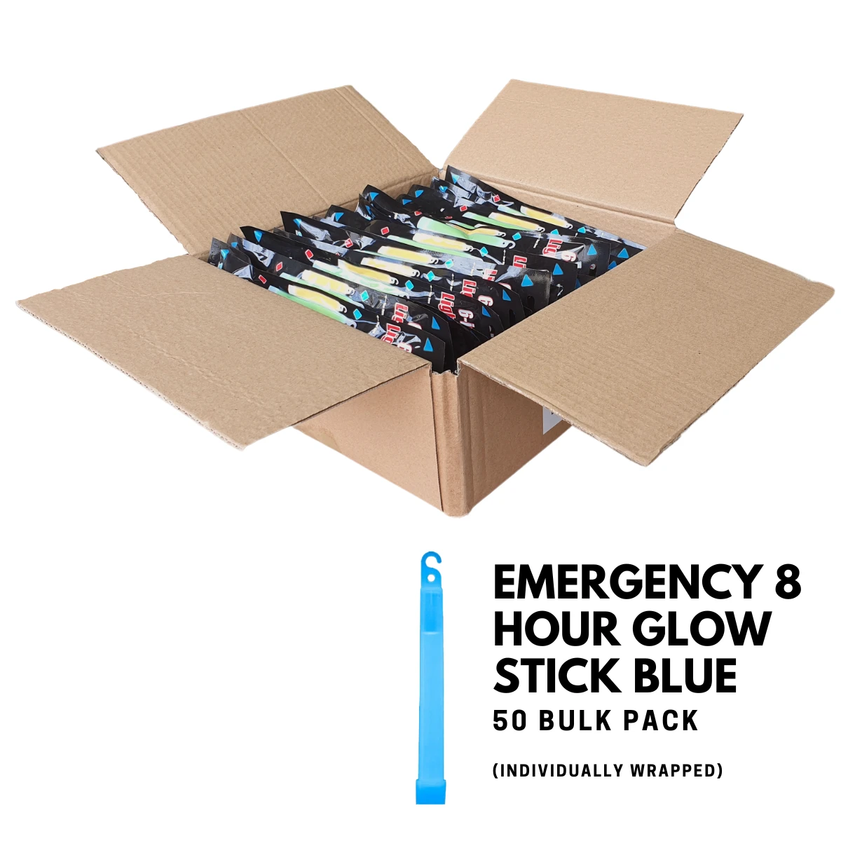 Emergency 8 Hour Glow Stick Blue 50 Pack The Emergency 8-Hour Glow Stick is ideal for emergency short to medium-term lighting or to gain the attention of emergency services. Great for kids during power failures or lighting walkways etc. Now available in a bulk 50-pack! Ideal for: Power outages Emergency Kits Camping Hiking Signalling Trail marker Scouts Army / Military use Specifications Quantity: 50 Pack Individually wrapped Glow Sticks Colour: Blue Dimensions: 150mm x 15mm (6 inch) Includes hanging hook Runtime: 8+ hours each Suitable for use with Military Map Reader (click here) (GlowBlue8hr50pk)