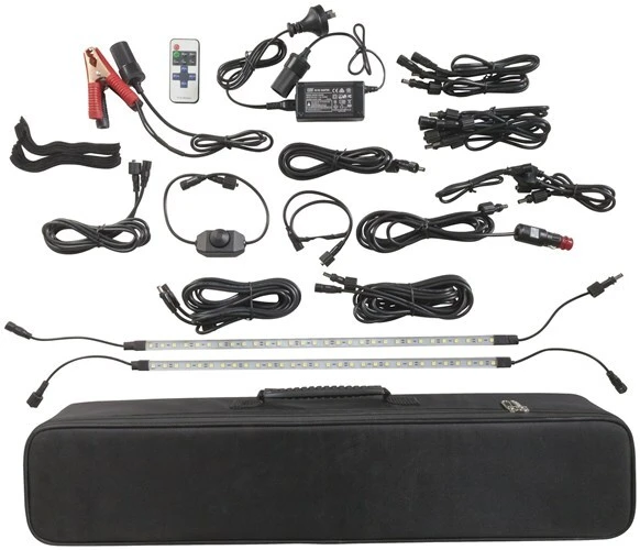 Waterproof LED Camp Lighti 4 Bar Kit This is a fast and effective way to provide light for a campsite, worksite, or anywhere you like. It’s built from four individual aluminium LED light strips, each one featuring 30 LEDs for 500 Lumens of light. That’s 2,000 Lumens for the whole kit, which is a lot of light! Everything is plug and play, with two 5m cables, two 2.5m cables, two 1m cables, four 0.5m cables, and a 3 to 1 joiner, you can connect them however you like to suit your particular use. A remote control for brightness and on/off is included, as well as three on/off dimmer switches, all contained in a convenient nylon carry case. They’re powered by 12VDC, with battery clips and a cigarette lighter socket provided. You can easily run from mains power using a 12V adaptor too, making them perfect for Camping. Features Perfect for Camping Powered by 12V Includes Nylon Carry Case Combined 2000 Lumens! Specifications Includes: 4 x LED Light Bars, 1 x Nylon Carry Case, 1 x Remote Control, 1 x Remote Control Receiver, 3 x On/Off Dimmer Switch, 2 x 5m Quick Connect Cables, 2 x3.5m Quick Connect Cables, 2 x 1m Quick Connect Cables Light Rating Lumens: 2000lm (4x 500w) IP Waterproof Rating: IP67 LED Power: 7W LED Voltage: 12V Illuminated Colour: Cool White Colour Temperature: 6000K Width: 13mm Height: 520mm Depth: 7mm Current Draw: 2.33A (SL-8969)