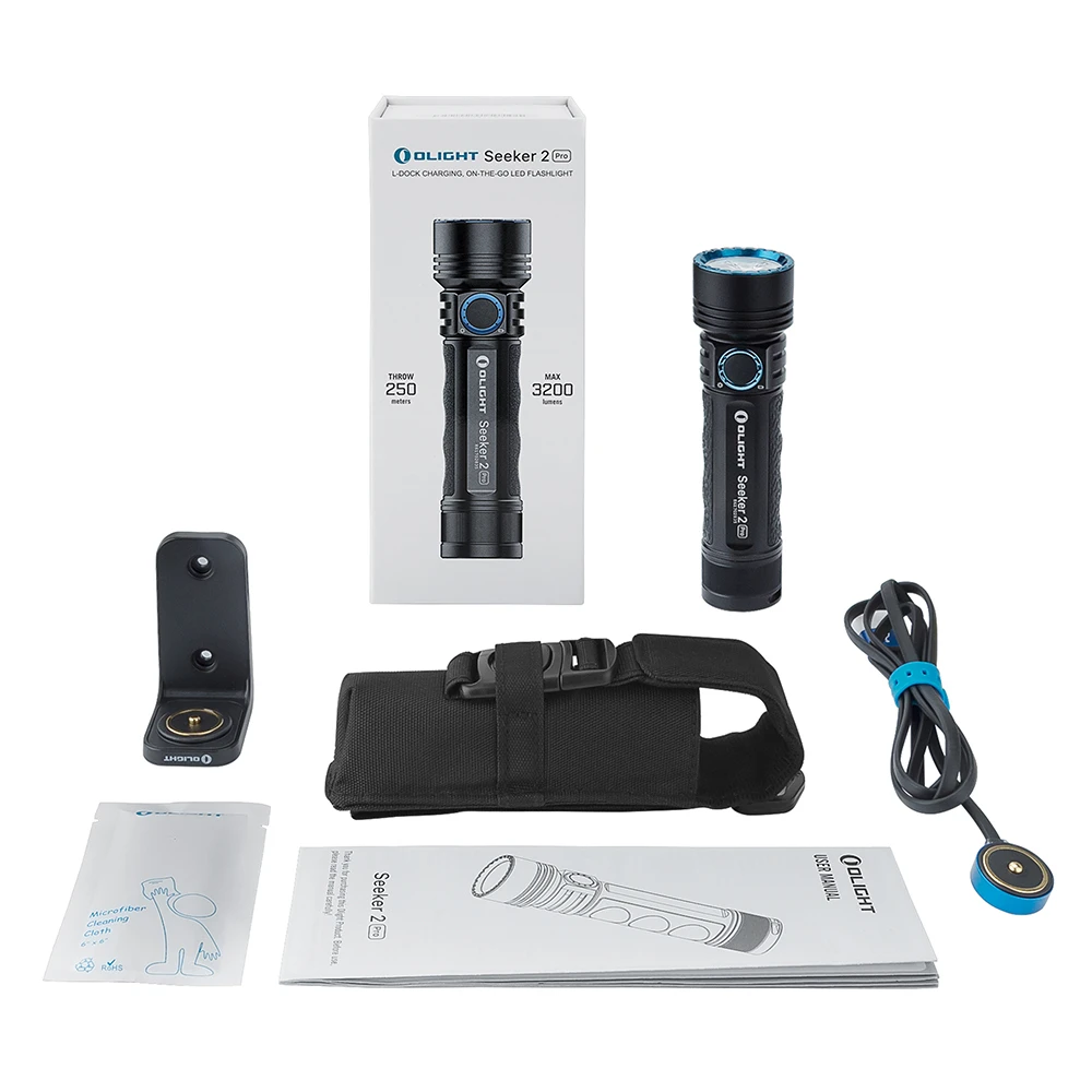 OLight Seeker 2 Pro 3200 Lumens Rechargeable LED Torch Powered by a single 5000mAh 21700 customized lithium rechargeable battery that helps this light deliver a maximum output of 3200 lumens. The Seeker 2 pro is a powerful, rechargeable side-switch LED flashlight. It uses high-quality LEDs paired with a TIR optic lens, providing a perfect medium and close-range illumination experience. The ultimate Torch made for the serious Survivalist. High-quality LEDs paired with a TIR optic lens Providing a perfect medium and close-range illumination experience A Perfect Medium And Close-Range Illumination Flashlight Humanized Body Design – The Seeker 2 pro features a large side switch located near the head of the light for comfortable thumb operation and indicators on both sides of the switch clearly display the battery power and brightness level. With milled finger grooves and dermatoglyphic silicone, the Seeker 2 pro is ergonomically designed to be extremely comfortable and provides a non-slip grip. Versatile Charging System – The Seeker 2 pro includes a 3.9 ft long 1A magnetic USB cable (The MCC1AL is compatible with OLIGHT S1R / S1R II / S10R III / S2R / S2R II / S30R III H1R / H2R / M2R / Warrior X / Seeker 2 Pro). The provided L-dock can be attached to or fixed on a wall close to a power source for quick and easy access. Compatible with most USB power sources, the magnetic charging cable is convenient to use, making it an ideal illumination kit to be used at home, outdoors, or while on duty. Specifications: Charge type: Magnetic charging cable Compatible Batteries: customised Olight 21700 5000mAh Light Intensity (candela): 15600 Mode Operation: Side Switch Beam Distance: 250m Max. Performance (lumens): 3200 Series: Series R (Rechargeable) Light Form: Standard hotspot diameter with impressive distance. The perfect all-around beam profile. Lens / Reflector Type: Smooth reflector (central area and flood area) LIGHTING LEVELS: LEVEL 1 (lumens): 3200 Run-time LEVEL 1: 3200 lumen (~600lm); 2+150 minutes LEVEL 2 (lumens): 1200 Run-time LEVEL 2: 1200 lumen (~600lm); 110+30 minutes LEVEL 3 (lumens):300 Run-time LEVEL 3: 9.7 hours LEVEL 4 (lumens): 50 Run-time LEVEL 4: 50 hours Strobe: Yes Run-time LEVEL 5: 12 days LEVEL 5 (lumens): 5 SOS / BEACON: No Waterproof: IPX8 Weight (g / oz): 198 / 6.98 Length (mm / in): 128 / 5.04 Head Diameter (mm / in): 35.0 / 1.38 Body Diameter (mm / in): 28.0 / 1.10 Led: XP-L LED Use: search and rescue, camping, industrial, security, police, self-defence, outdoor Includes: Seeker 2 Pro (Battery included) MCC1AL Magnetic Charging Cable Self-Adhesive Ply-Yarn Drill L-dock Charging Kit Holster Cleaning Cloth User Manual (Seeker2Pro)