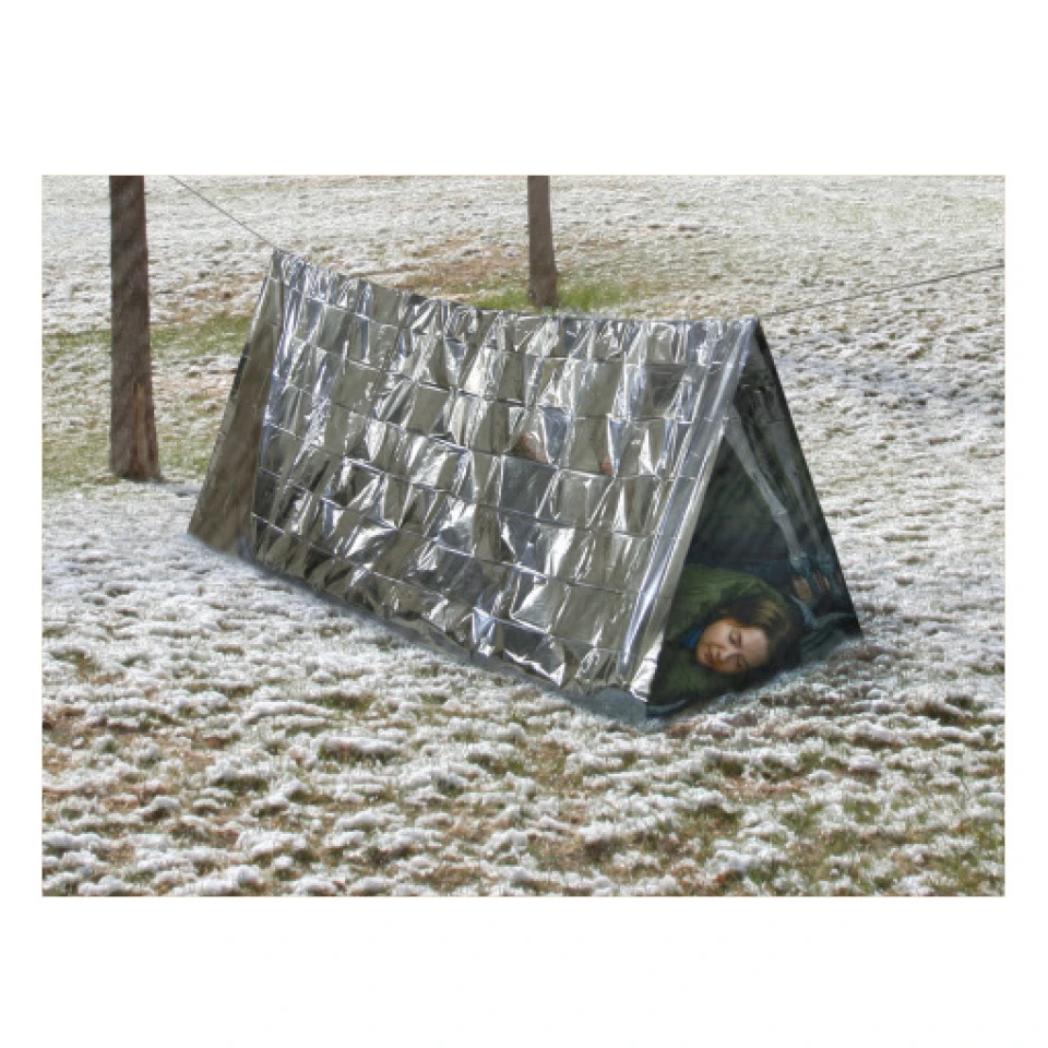 Survival Reflective Tent A great single-person emergency shelter for backcountry excursions and hunting trips, the Survival Reflective Tent’s highly-reflective material can be seen at great distances and also conserves body heat. A great single-person emergency shelter for backcountry excursions, hunting trips or survival situations, the Survival Reflect Tent’s highly-reflective material can be seen at great distances and also conserves body heat. It sets up within minutes using the included 14 feet of suspension cord. Features: A-Frame No poles needed. Lightweight, single-person emergency shelter sets up in minutes; aluminized material is highly visible and conserves body heat Essential item for ultralight backpacking, hunting, wilderness survival, and emergency preparedness Lightweight, easy to pack Fire-retardent Easy to set up with just the included 14 feet of suspension cord; no poles needed Survival Reflect Tent can be used for heat deflection, body heat insulation, and a rain and wind barrier Specifications: Weight: 5.2 ounces (147 grams) Size: Open: LxW: 56 x 96 inches (244 x 91 x 97 cm) Folded: LxWxD: 6 x 4.25 x 0.9 inches (152 x 108 x 23 mm) (U-20-190-1500)
