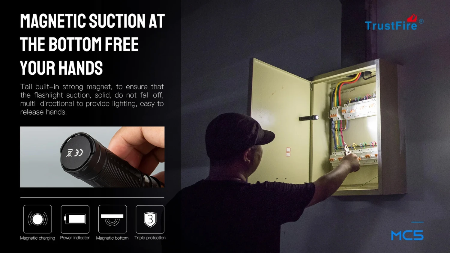TrustFire MC5 Magnetic Tactical Flashlight 3300 Lumens Max 3300 lumens, 360 meters of flood throw and 11 days of run time. Features high, med, low, eco SOS & strobe modes to cope with different needs Both the light tail magnetic design, making it easy to attach MC5 to a metallic surface. Magnetic charging is very convenient and easy to operate in the dark. Features: Internationally patented latest generation LEDs give a lifespan of 50,000 hours Neck magnetic charging, with charging indicator and power indicator functions, magnetic charging cable included Magnetic Base for hands-free use Built-in intelligent temperature control system to prevent the flashlight from overheating during use and improve comfort for user Constant current circuit, constant brightness, mode memory Low-battery warning Anti-reverse connection design prevents the battery from being installed backwards and causing harm to the circuit Made of aviation grade aluminium AL6061-T6 The surface is anodised with three levels of military-standard anti-wear treatment 3 Year Manufacturers Warranty Specifications: Size: 112.5mm (tube length) x 30mm (head diameter) Net weight: 60.8g (without battery) (MC5)